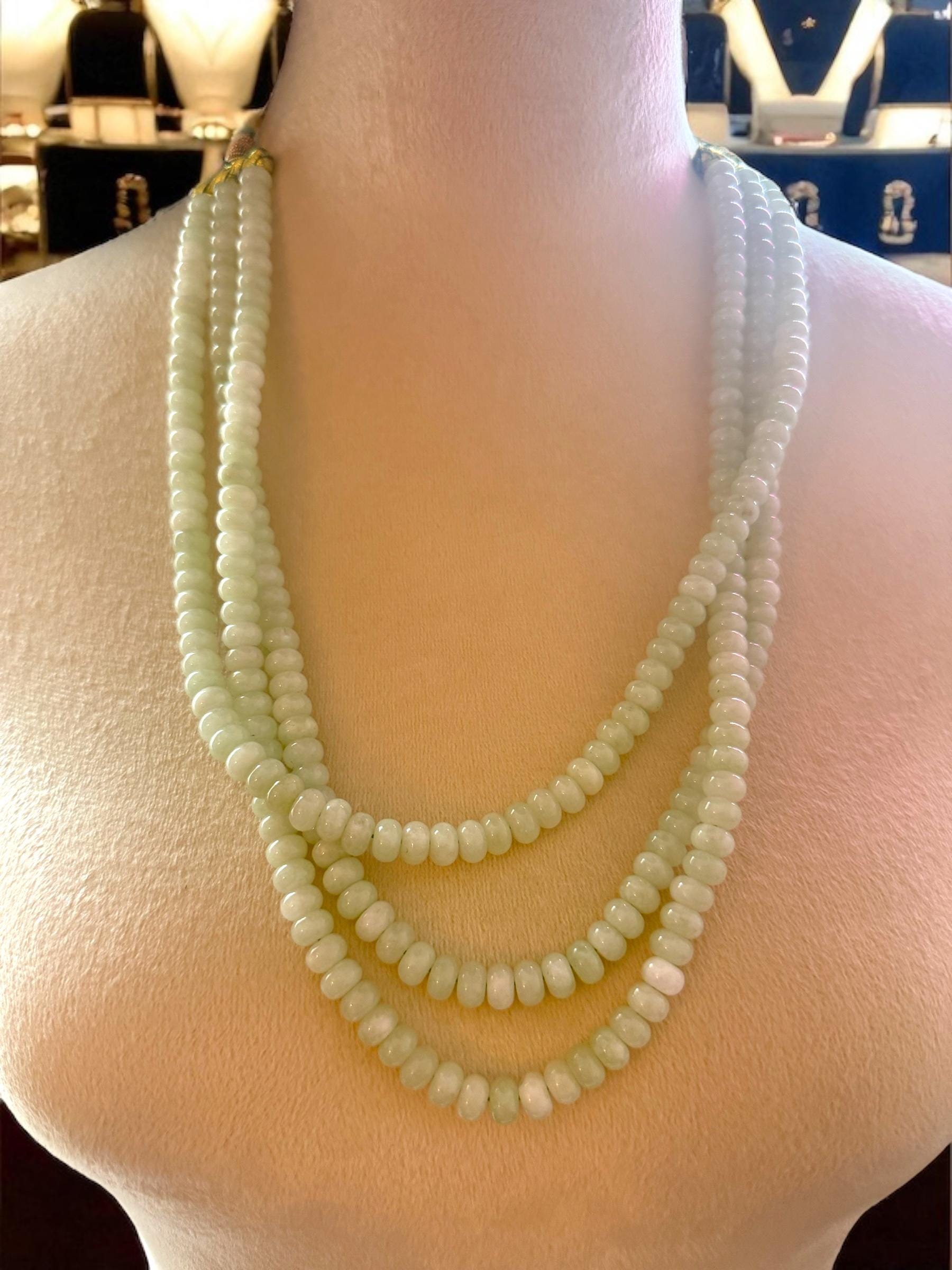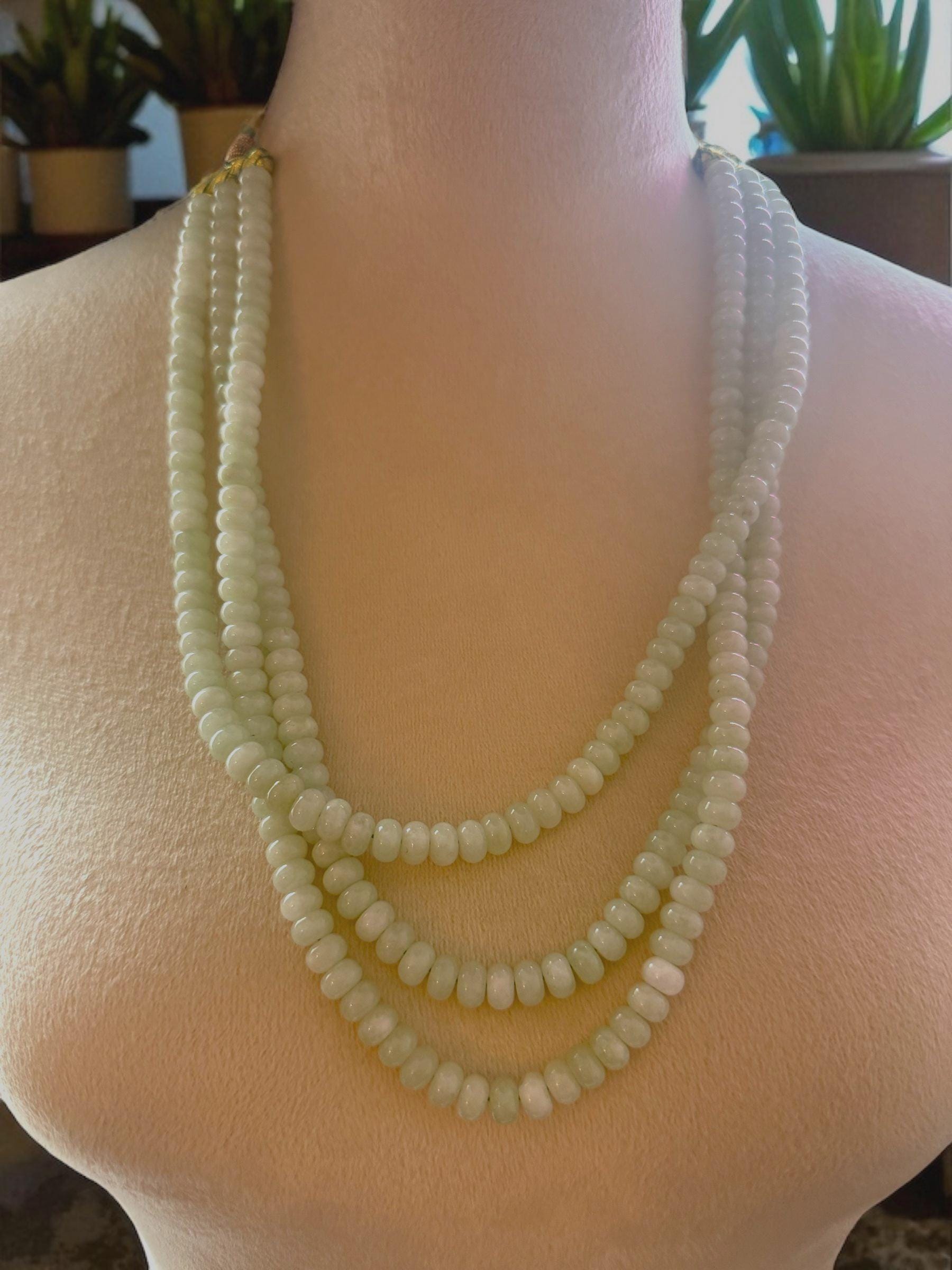 Elevate your style with the timeless beauty of jade. This exquisite triple-strand necklace features smooth, polished jade beads in a soft, soothing green hue. The graduated lengths create a layered look that drapes elegantly on the neckline, making it perfect for both everyday wear and special occasions. Known for its calming energy and symbol of harmony, jade adds a touch of serenity and sophistication to any outfit.